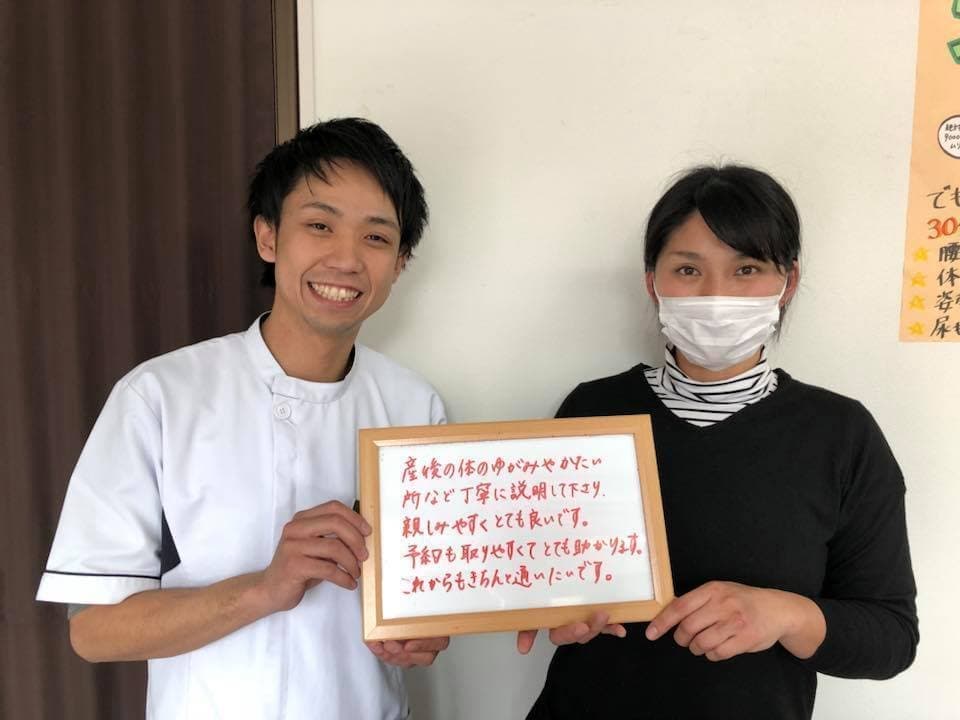 産後の体のゆがみやかたい所など丁寧に説明して下さり、親しみやすくてとても良いです。予約も取りやすくてとても助かります。これからもきちんと通いたいです。